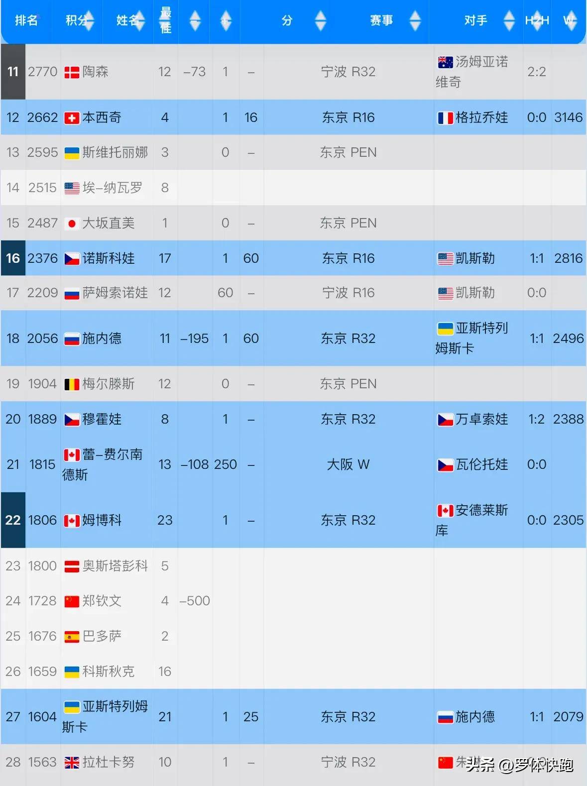 网球联赛,ATP赛程,WTA积分,网球直播入口,网球世界排名,四大满贯赛/实时更新全球网球联赛2025赛程、比分、排名及直播,全面覆盖ATP男子联赛、WTA女子赛事、四大满贯及国内网球比赛,为中文网球迷提供权威资讯与竞猜预测支持。WTA国际女子网球协会今天更新了最新一期的女单世界排名。从本周开始,去年WTA年终总决赛和WTA500东京站的积分被清除。中国球员郑钦文失去了去年东京站女单冠军的500积分和WTA年终总决赛的800积分,导致她的总积分从3028分下降到1728分,排名也跌至第24位。