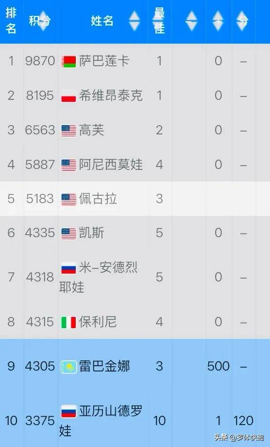 在上周的Top10球员中,前五位并未参赛,而排名第6至10位的球员中,四位都参加了WTA500宁波站比赛。米拉·安德列耶娃在女单第二轮出局,鲍里妮止步四强,莱巴金娜和亚历山德洛娃分别获得女单冠亚军。以下是最新的Top10排名: