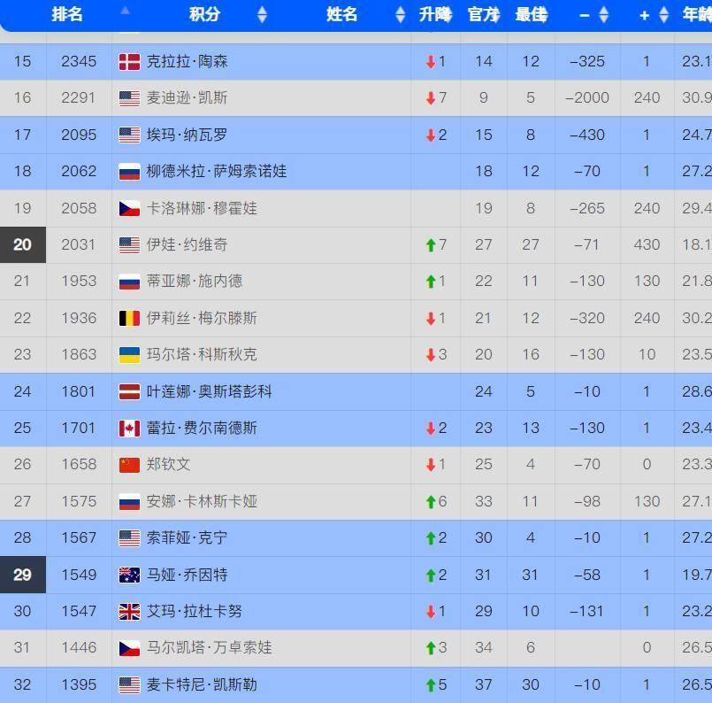 有人上升,就有人下滑。 美国新星高芙就成了“受害者”,她的排名下降了两位,从第三跌到了第五。 原来的第四名阿尼西莫娃和第六名佩古拉,位置都没变。 第七和第八名,分别被米拉-安德烈耶娃和鲍里妮占据。