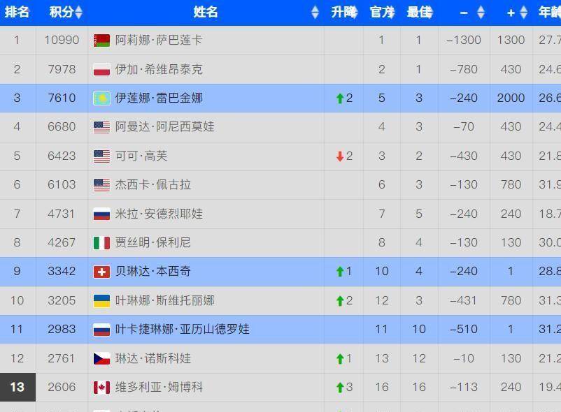 前十名里还有两个亮点,一个是产后复出的瑞士名将本西奇,她凭借稳定的表现重返前十,升到了第九位;另一个是乌克兰老将斯维托丽娜,她也回到了第十名的位置。
