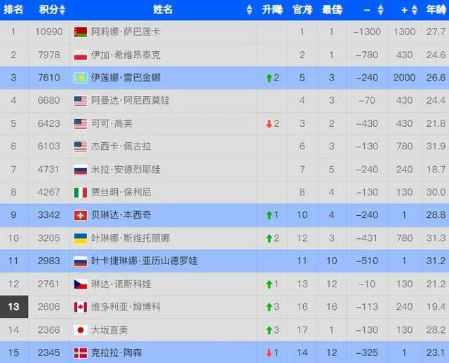 首先,我们聚焦世界前十。莱巴金娜凭借澳网的桂冠强势回归,重返世界前三的位置,而卫冕冠军斯瓦泰克则面临着严峻的排名保卫战。