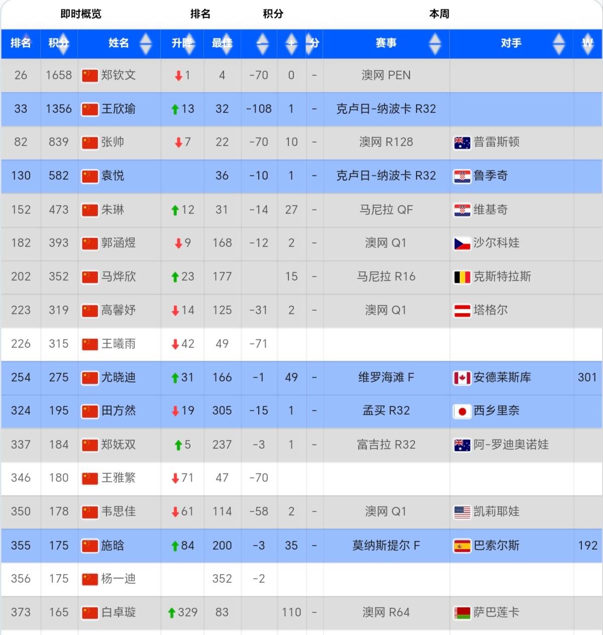 郑钦文因伤退赛,未能保住去年的积分,但仍然以第26位的排名稳居中国一姐的位置。王欣瑜则略显遗憾,虽然她在澳网首次闯入16强,排名上升至第33位,但未能更进一步,距离个人最佳排名仅一步之遥,与超越郑钦文也仅差一场胜利。